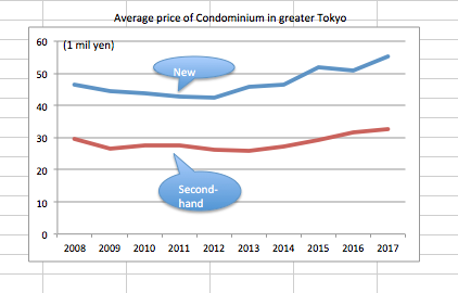 I am also attaching the historical charts showing average price of 3.3 square meter of condominiums in Tokyo between 2008 and 2017