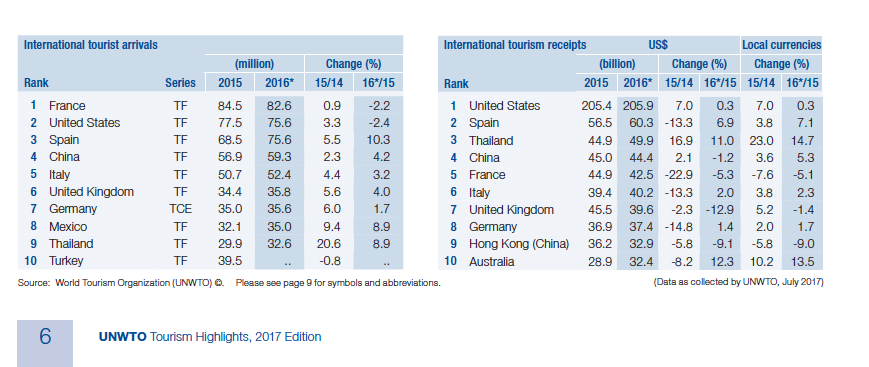 international arrivals ranking in 2016. In receipts, the US and Spain