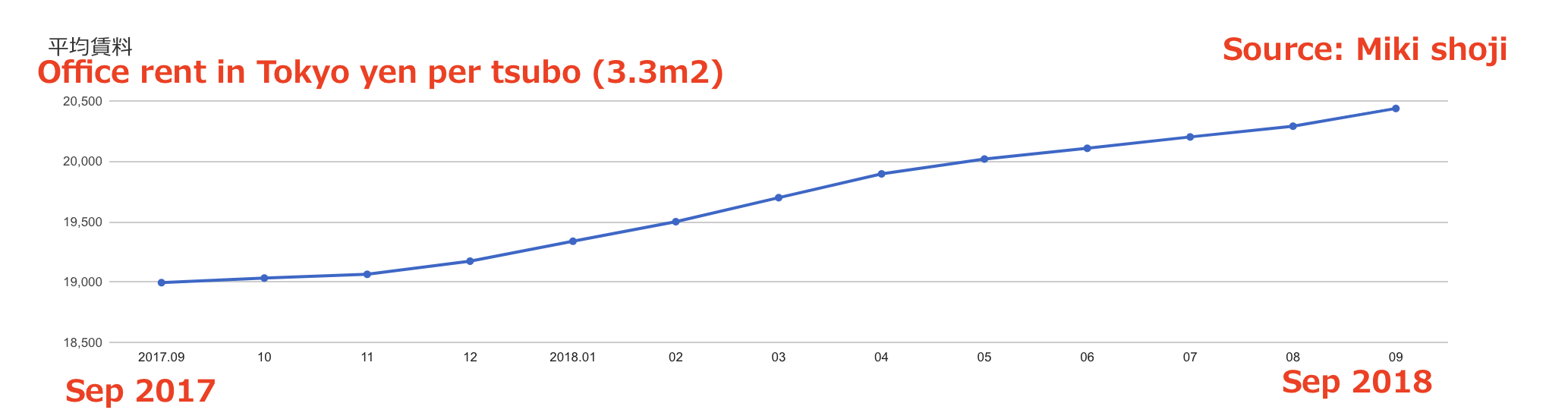 According to a report by the prominent Japanese real estate consulting firm ‘Sanki shoji’, the vacancy rate of offices in upscale locations in Tokyo as of September 2018 stands at only 2.33 percent (down 0.12 percent from the previous month) and the rents have been steadily rising in last twelve months.