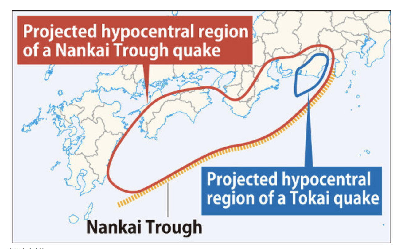 A major earthquake is expected to strike sometime along the Nankai Trough, a submarine trench running off the Japanese archipelago from around Shizuoka Prefecture in Honshu to the seas east of Kyushu.