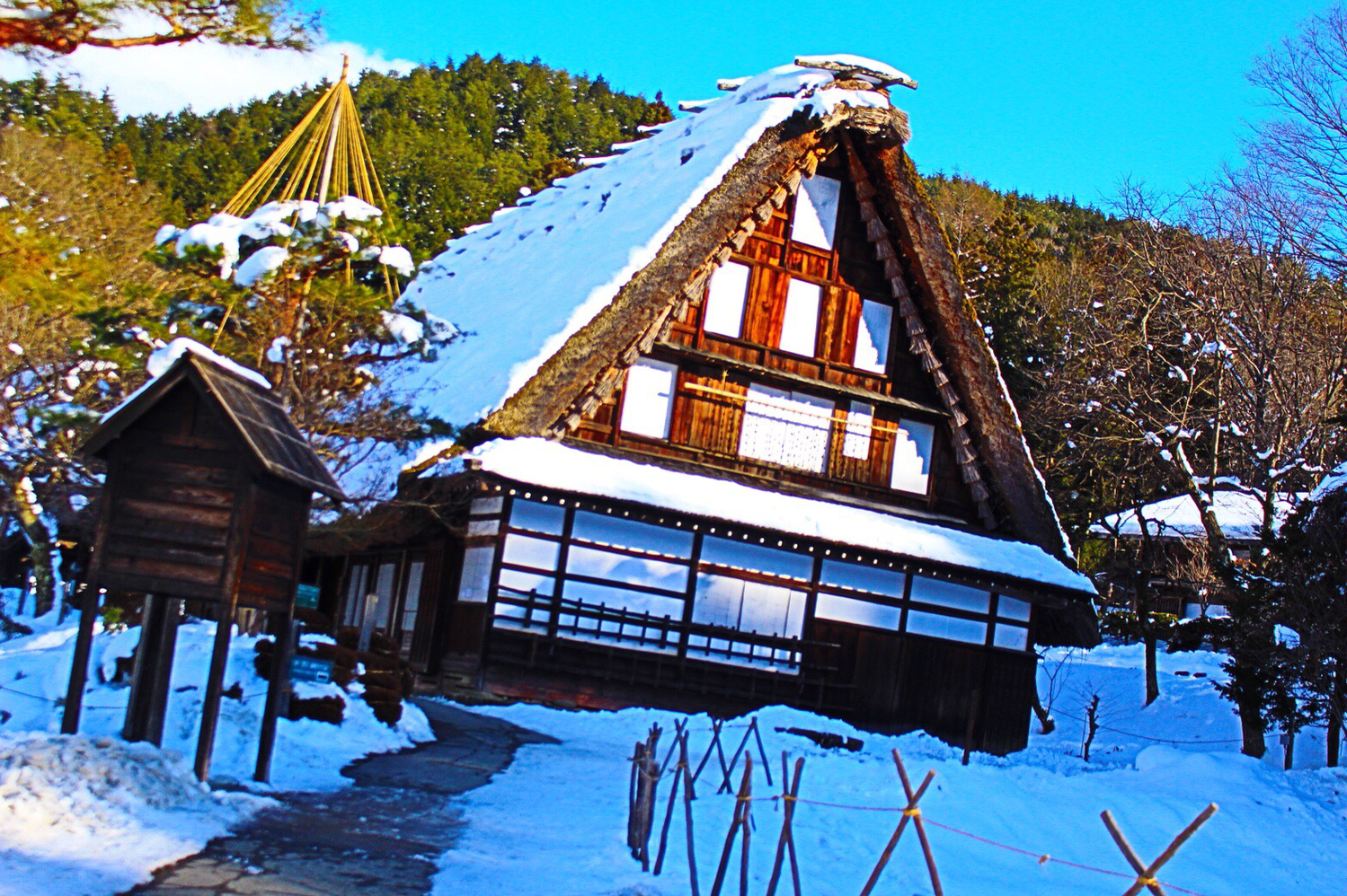 The name ‘gassho means’ means “hands together” as in prayer, referring to the steep roofs that keep the snow off in the winter.