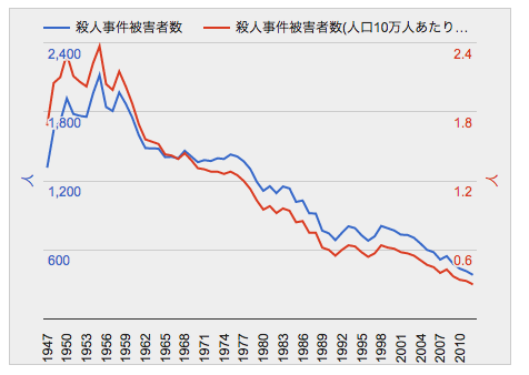 The blue and red chart indicate the gross number of homicides and homicide rate per 100,000 respectively (all Japan)