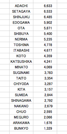 Please see the data showing the number of crimes in each Tokyo 23 ward.